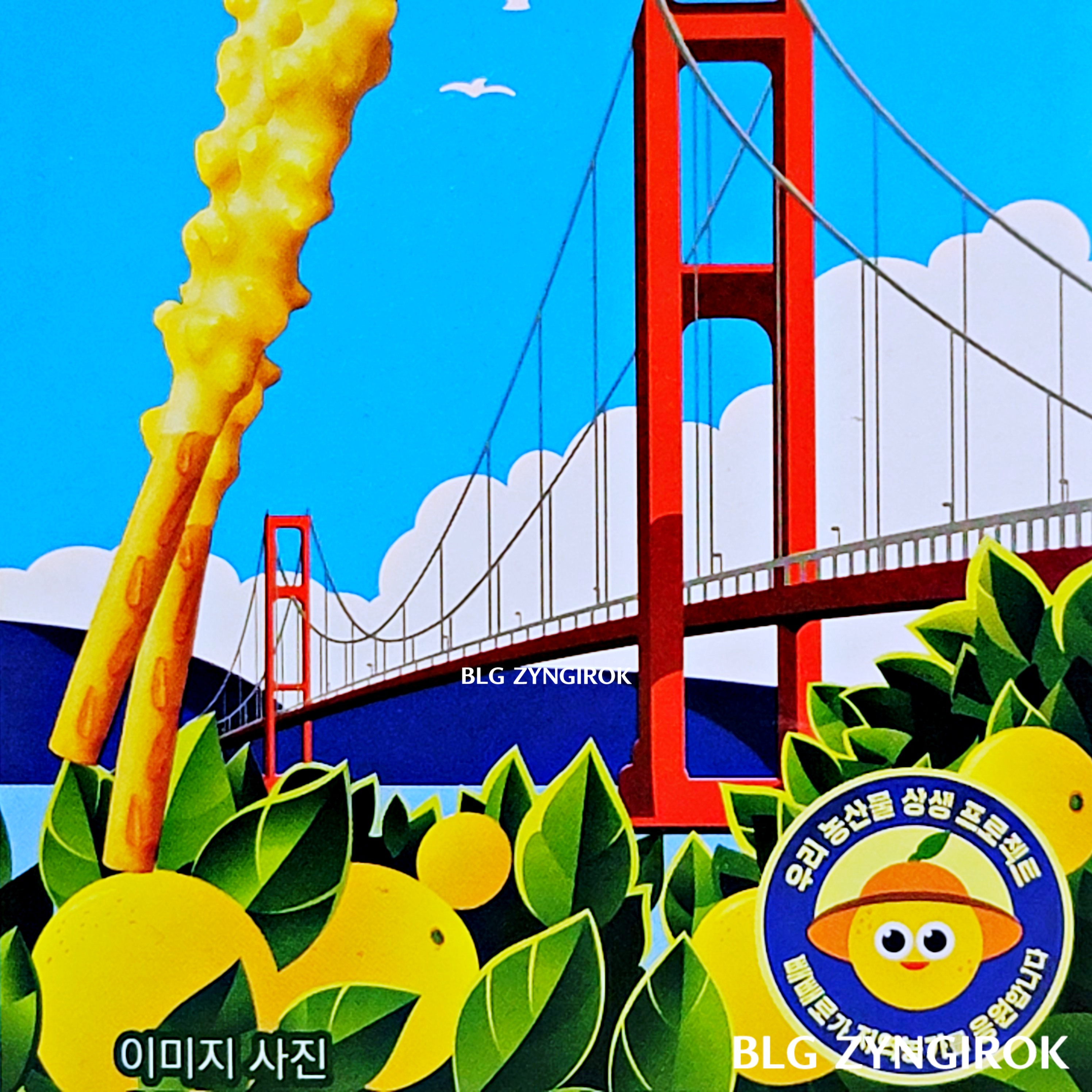 단순한 과자상자임에도 일러스트가 너무 아름답다. 청량한 하늘아래 노란 유자열매들이 상큼한 이미지를 잘 전달한다. '남해에 금문교와 비슷한 저런 멋진 다리가 있나?' 하는 생각에 남해 다리를 검새개 보니 그림속 멋진 다리는 '남해대교'라고 한다. 너무 멋져서 꼭 한 번 가봐도 좋을 곳이란 생각도 든다.