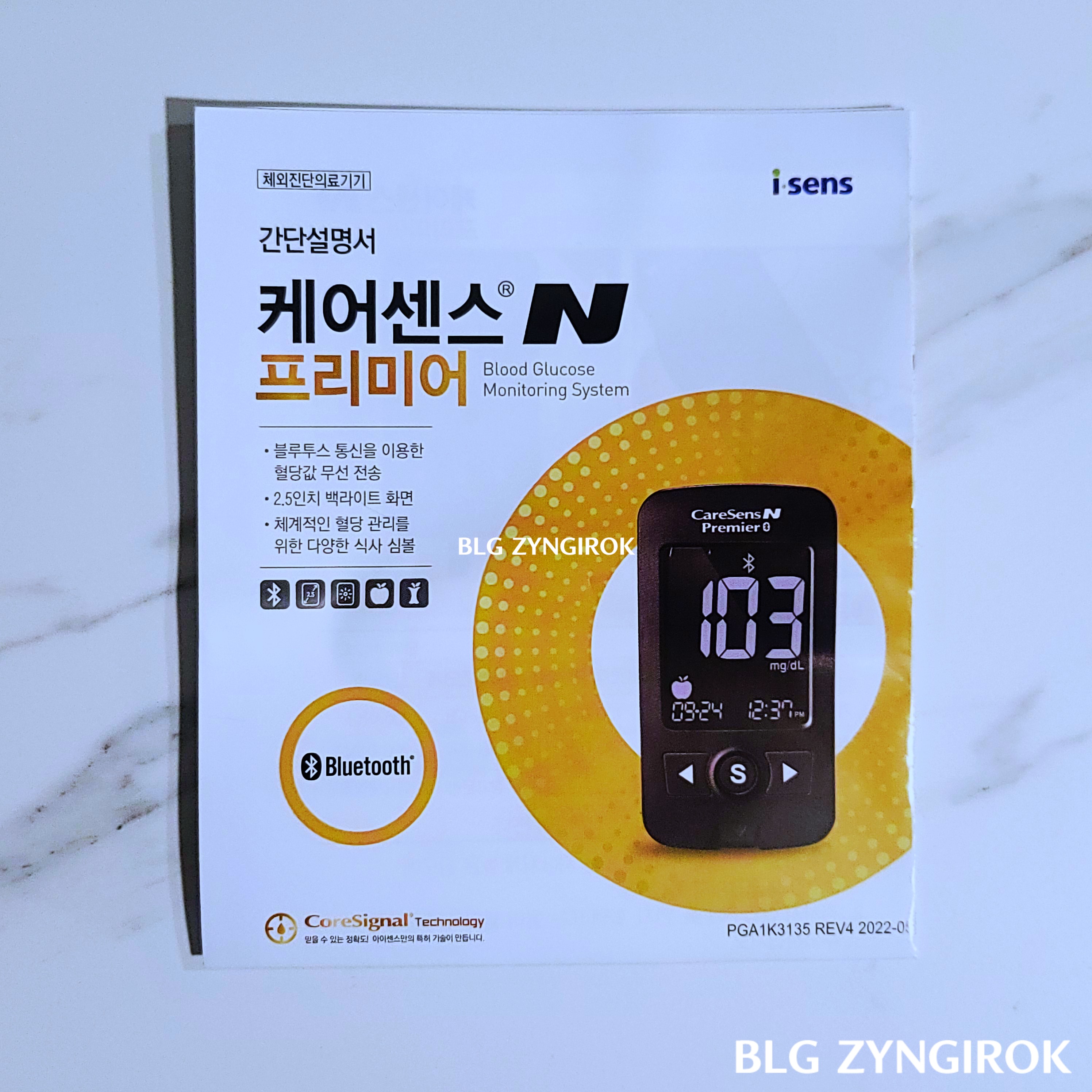 도구들은 휴대하기 간단하게 작은 사이즈이다. ZYN의 가족이 받은 제품은 케어센스N 프리미어라는 제품이다. 블루투스를 이용해 기기에 혈당 측정치를 자동 전송해준다고 한다.