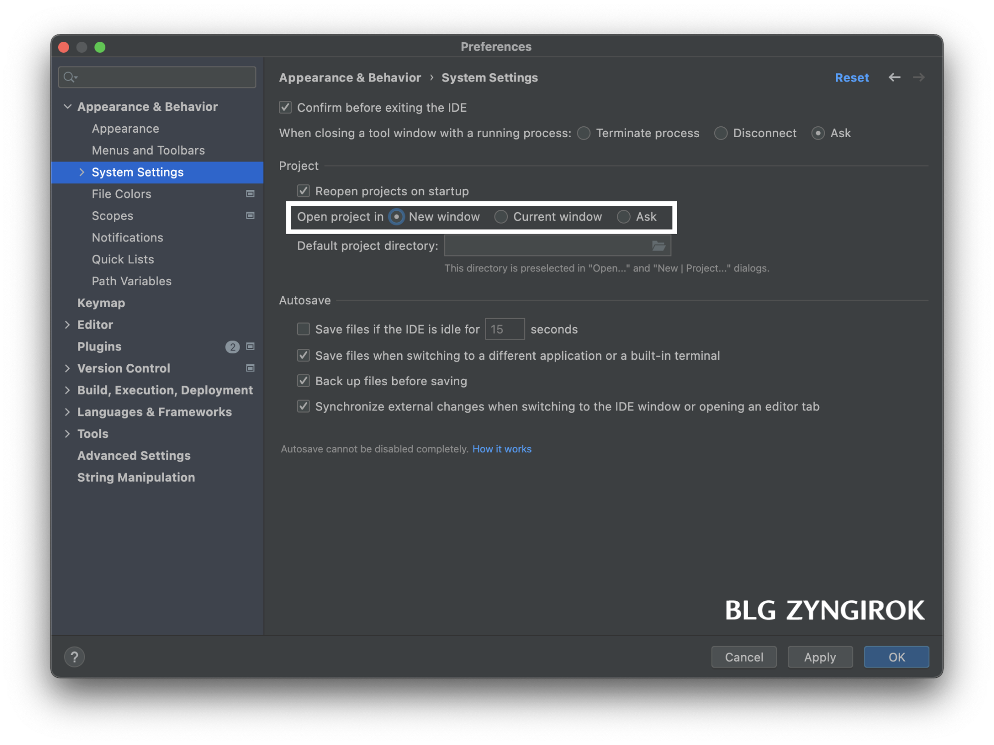 왼쪽 메뉴 리스트에서 "System Settings"를 선택하고 "Project"의 "Open project in"에서 "New window"를 선택하고 "OK"버튼을 눌러준다. 이렇게 하면 여러 개의 프로젝트를 실행할 수 있는 준비는 끝났다.