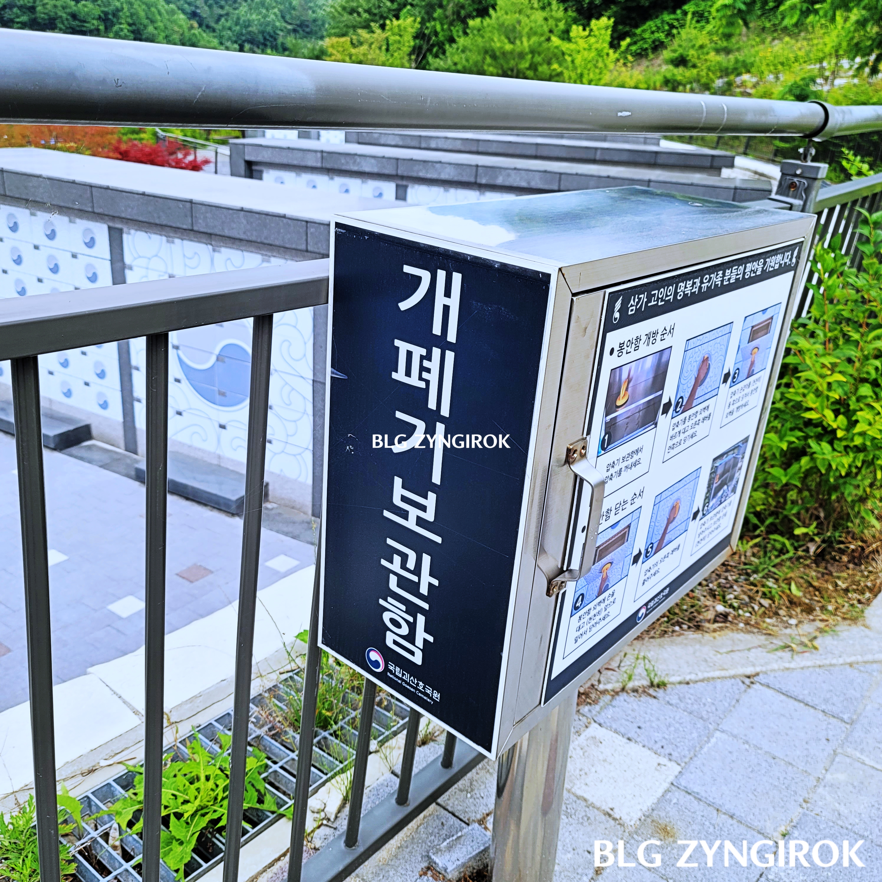 개폐기 보관함을 열어보면 개폐에 필요한 압착 손잡이가 들어 있다. 이 압착 손잡이를 유골함 철문에 부착 후 압착 시킨 다음 약간의 힘을 주어 잡아 당기면 아래로 열린다. 보관함 덮개는 안전하게 고정되어 열리니 떨어질까 염려하지 않고 알어도 된다.