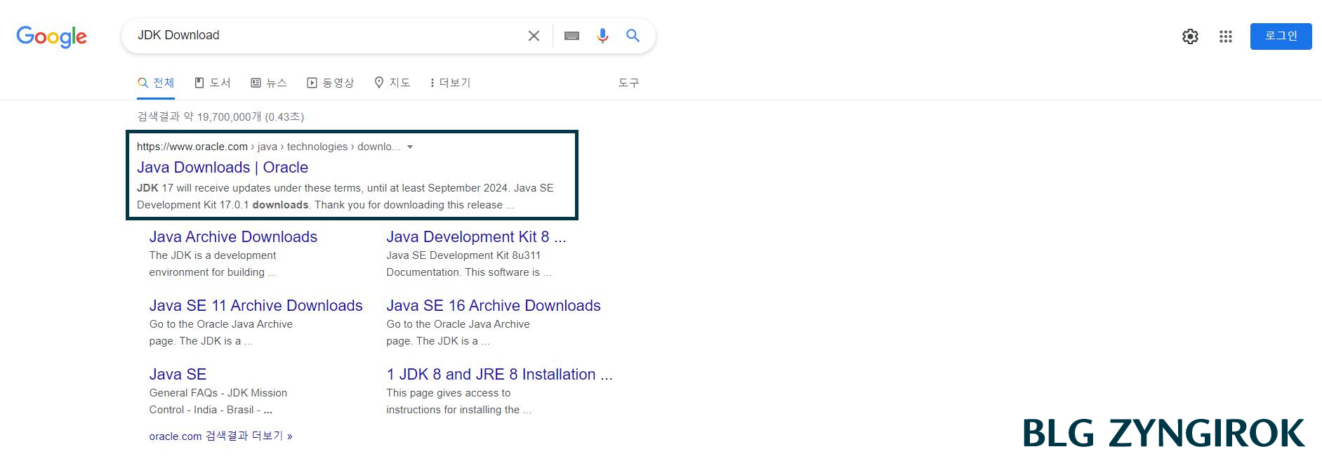 자바는 Oracle(오라클)이 소유하고 있기 때문에 오라클의 공식 사이트에서 다운로드 가능하다. 검색 결과의 첫 번째 링크를 클릭하면 된다.
