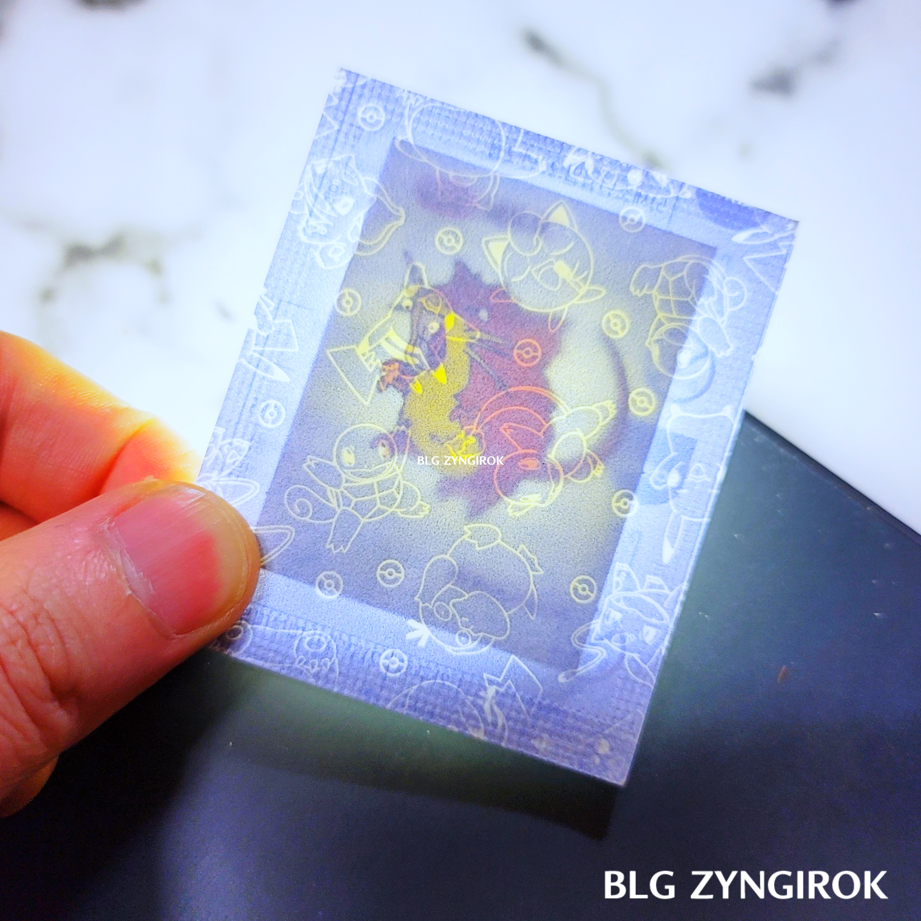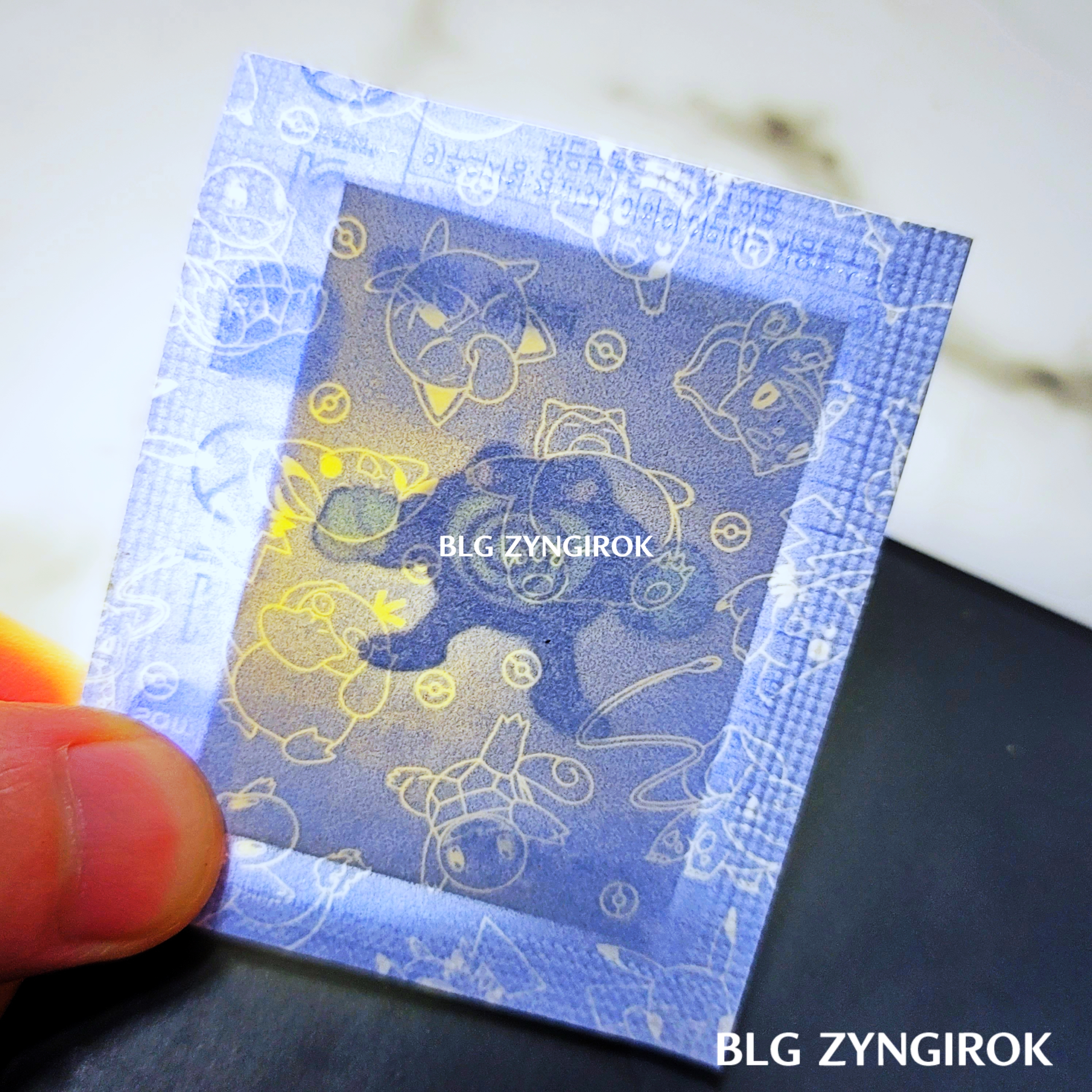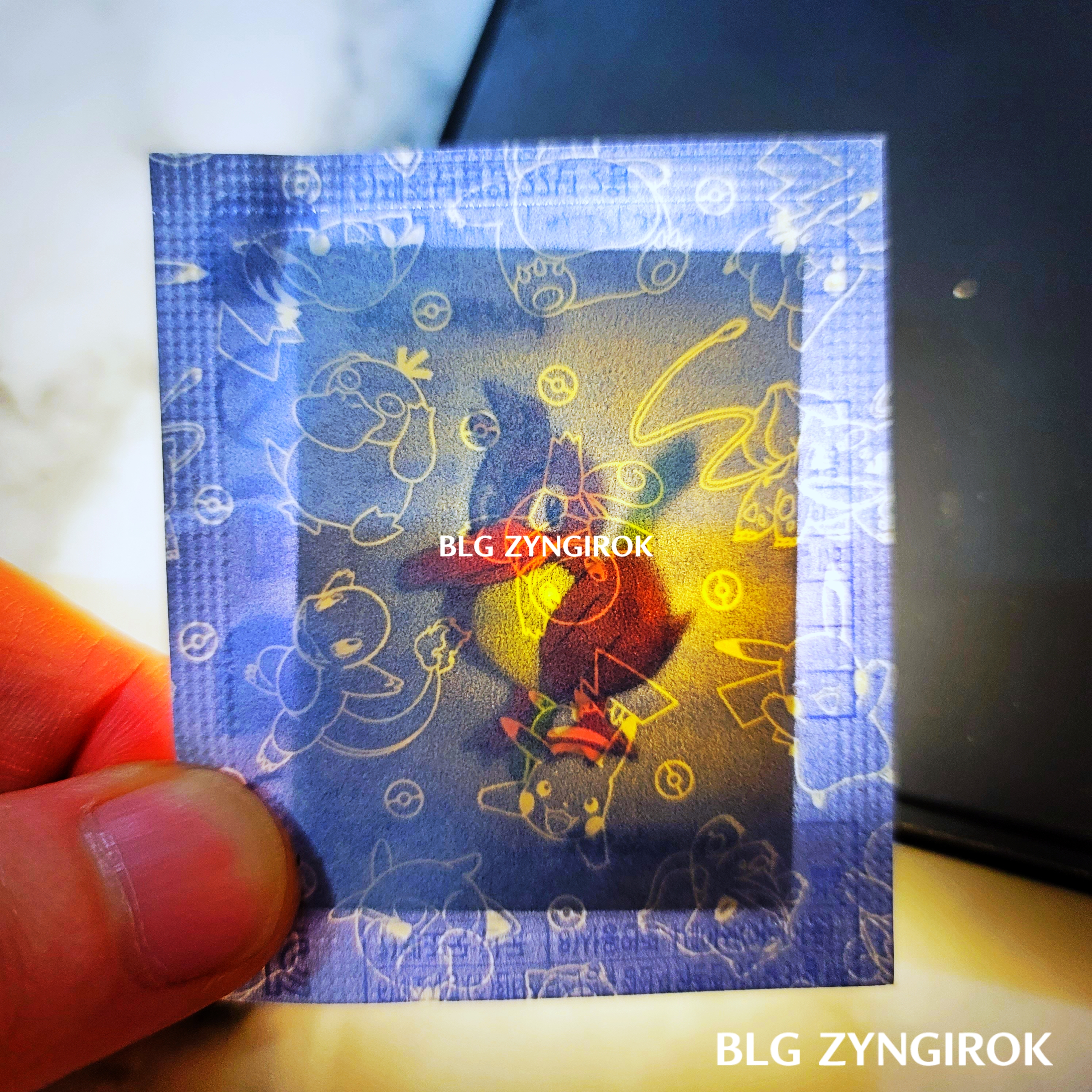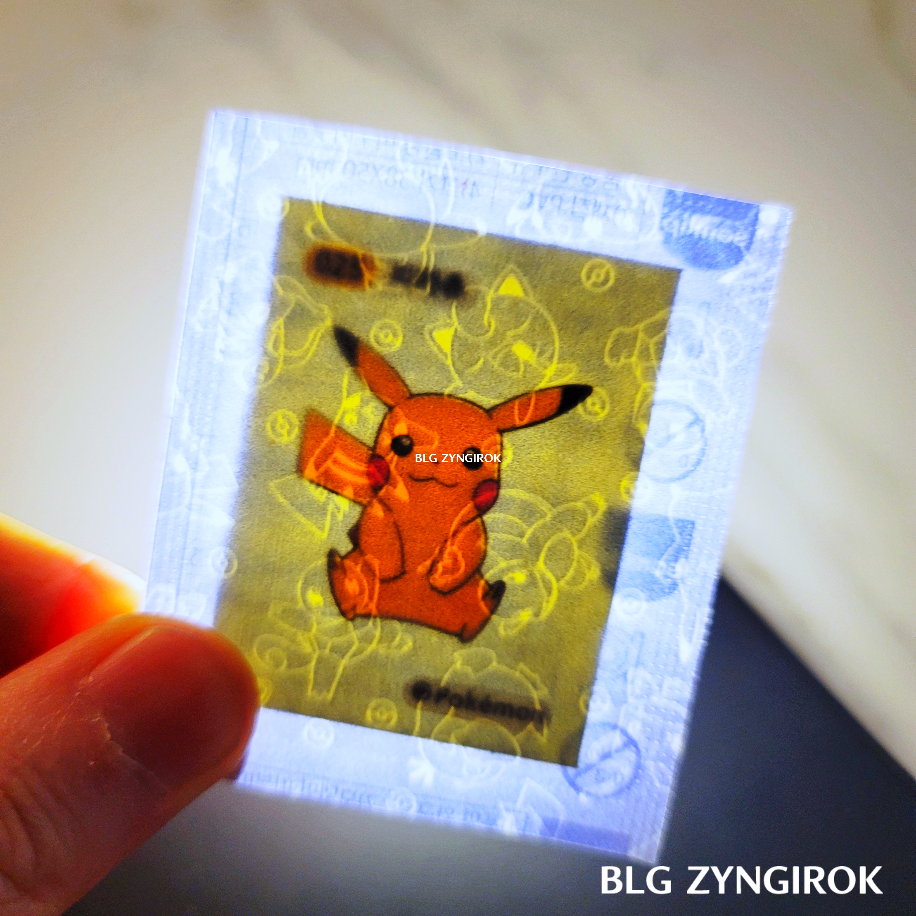 포켓몬스터빵-두개가-놓여있다.띠부띠부씰-피카츄를-들고있다.띠부띠부씰-윤겔라를-들고있다.