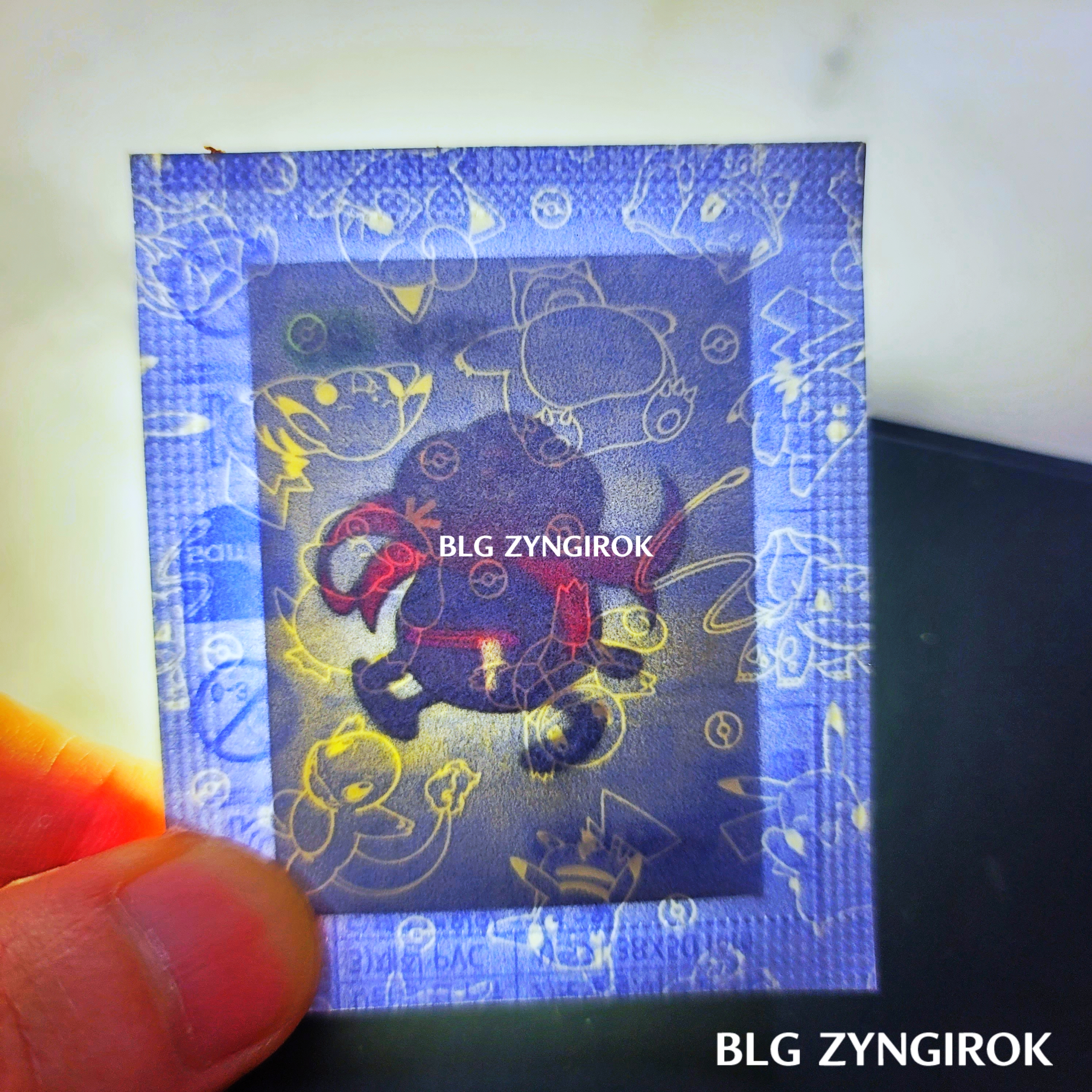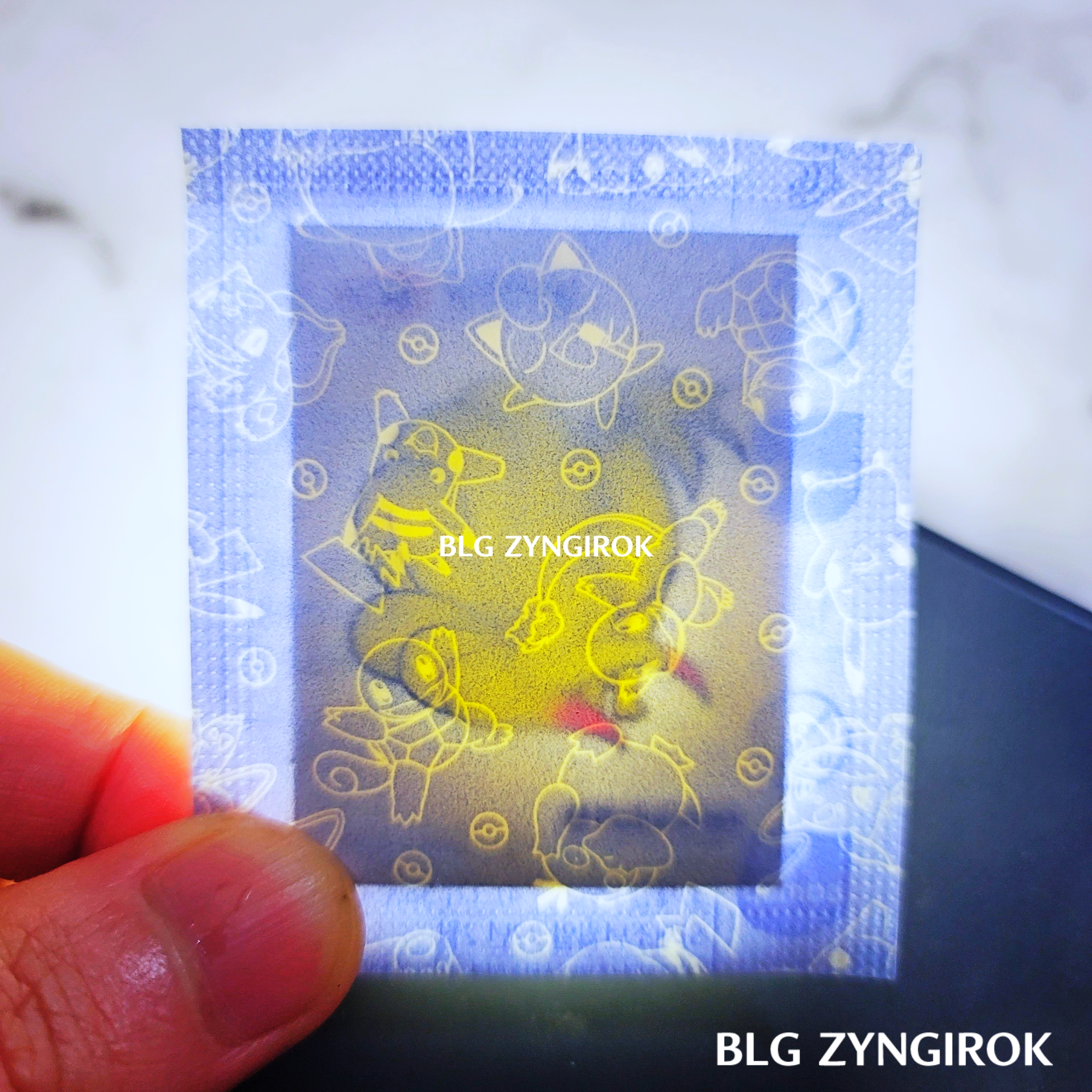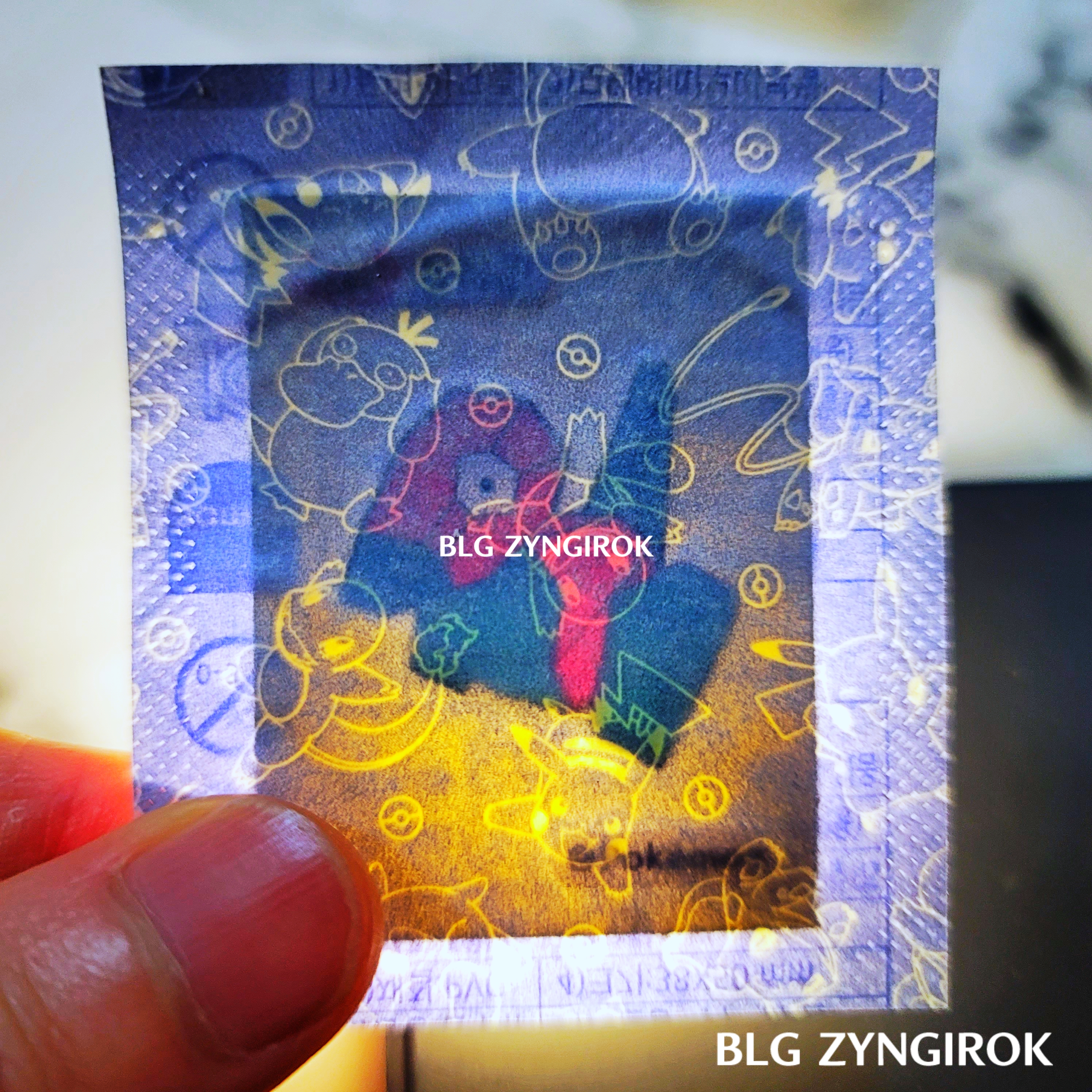 포켓몬스터빵-두개가-놓여있다.띠부띠부씰-피카츄를-들고있다.띠부띠부씰-윤겔라를-들고있다.