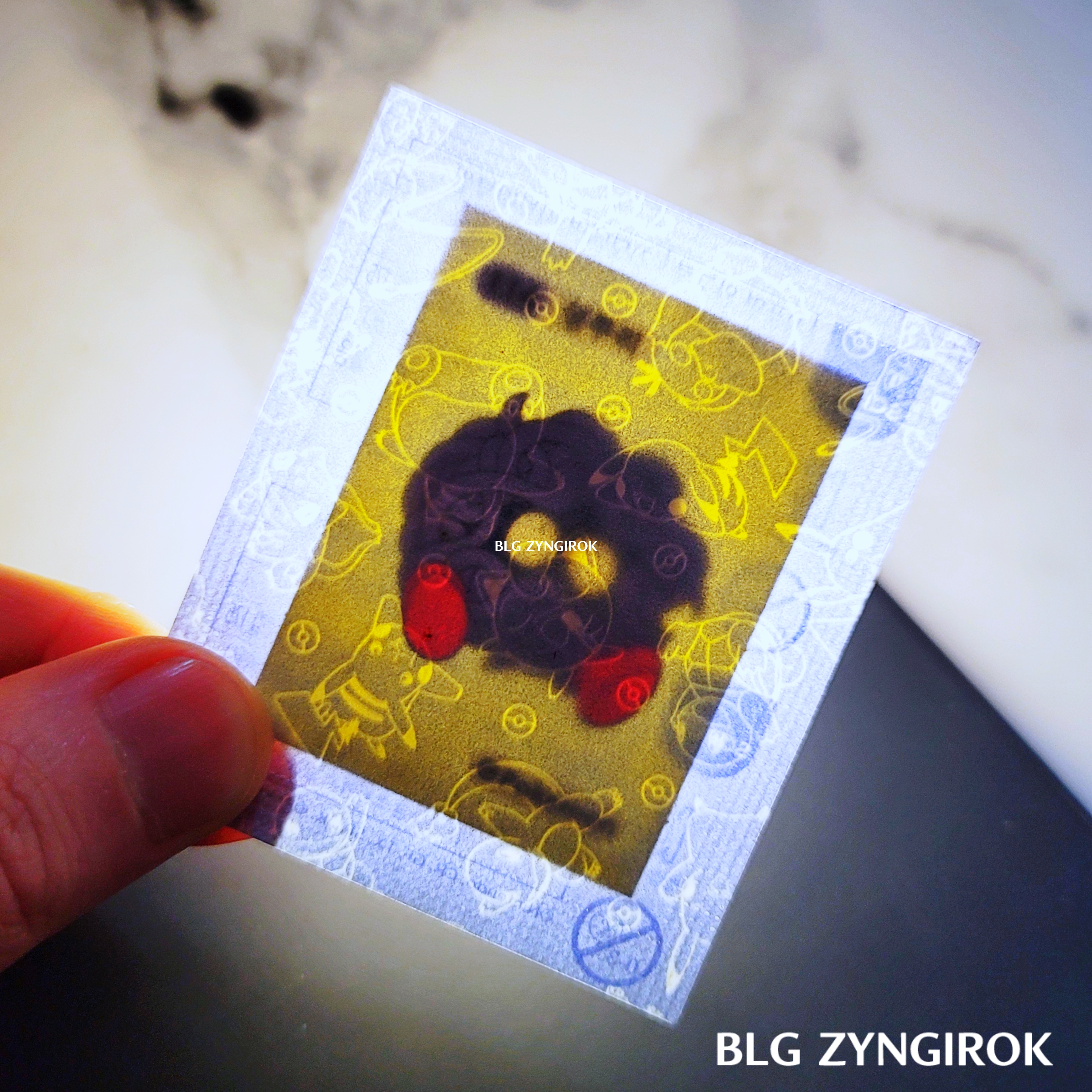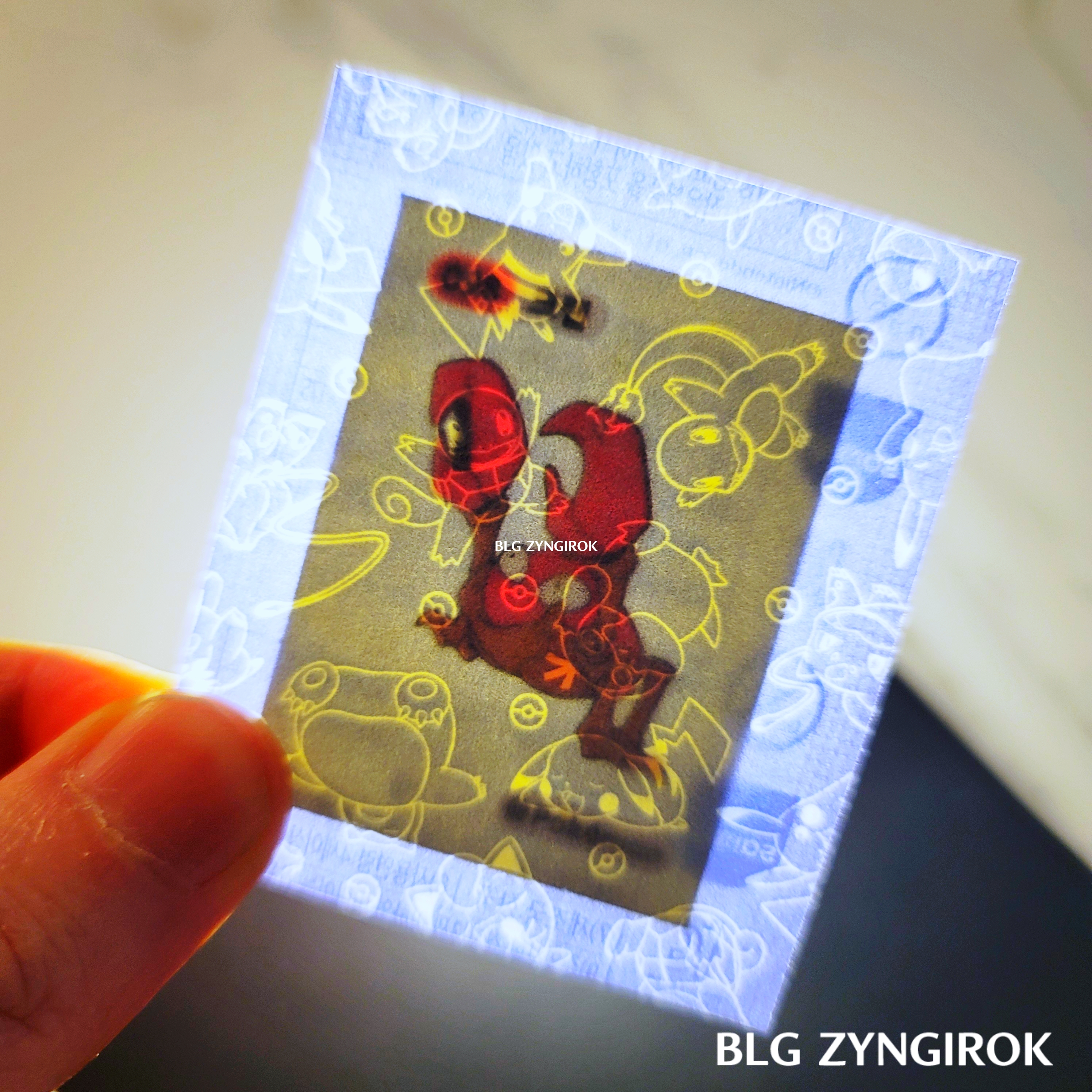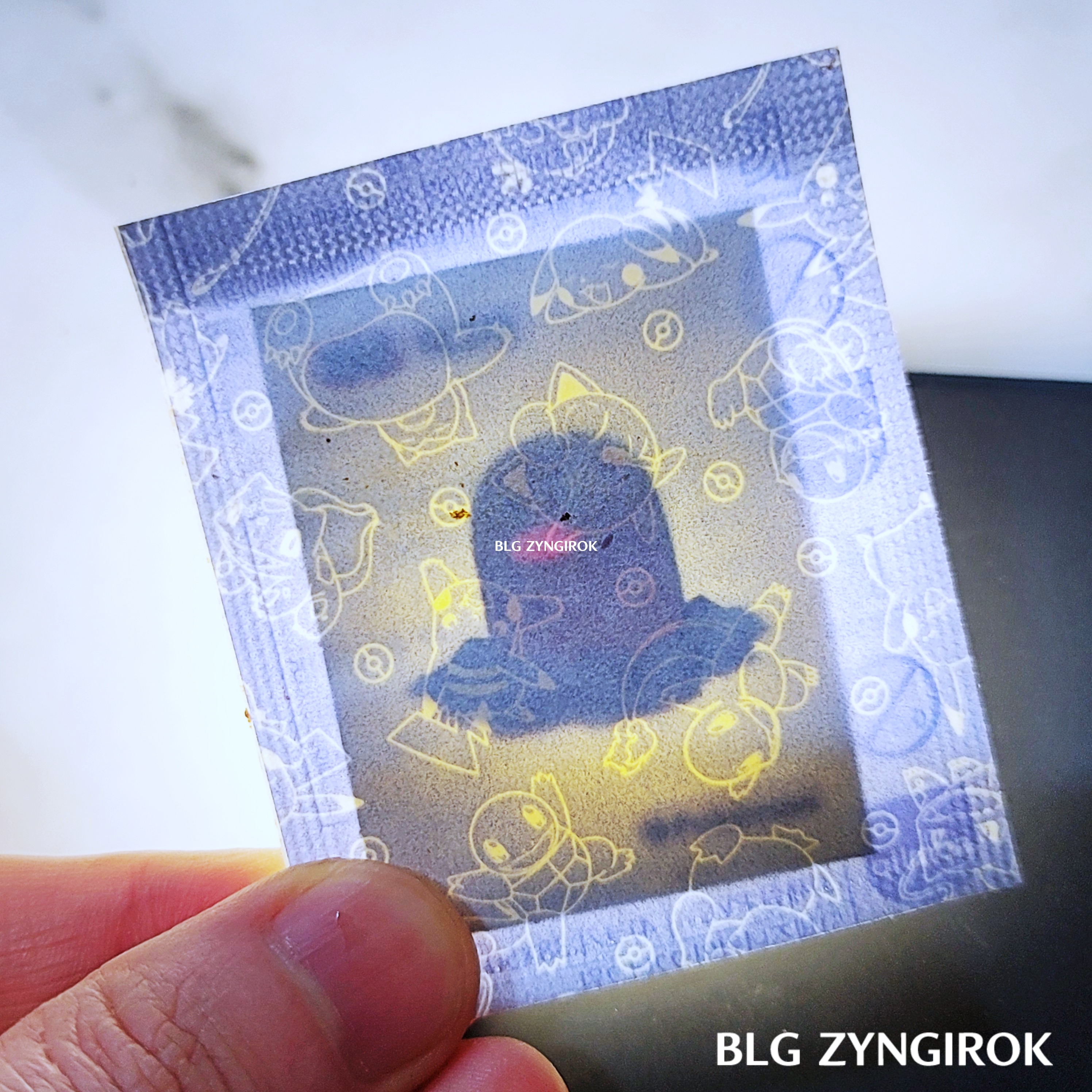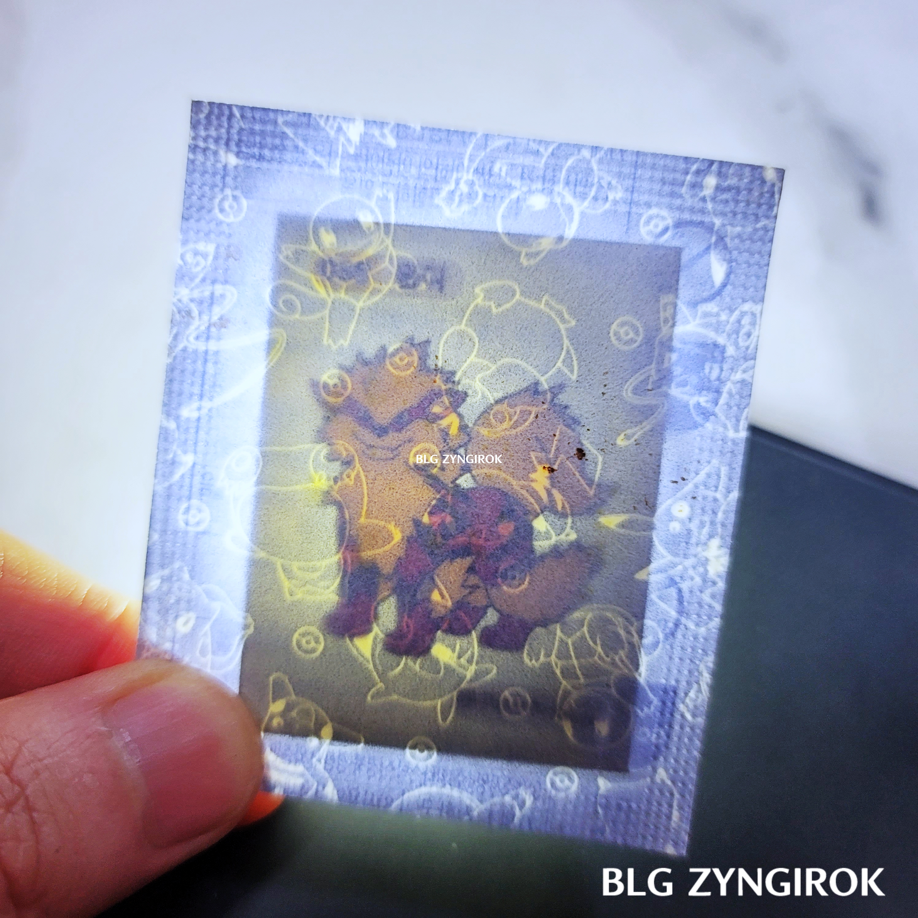 포켓몬스터빵-두개가-놓여있다.띠부띠부씰-피카츄를-들고있다.띠부띠부씰-윤겔라를-들고있다.