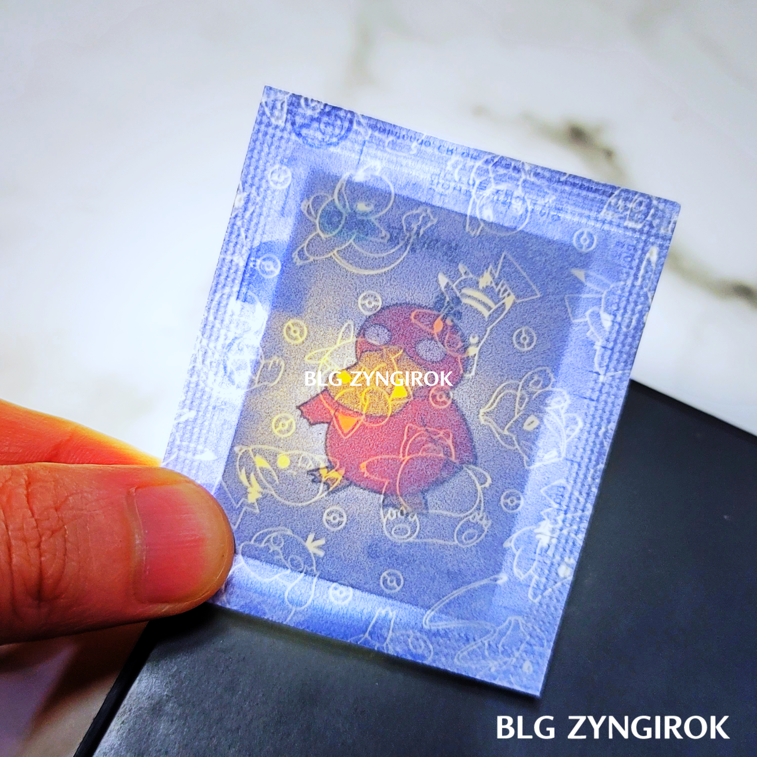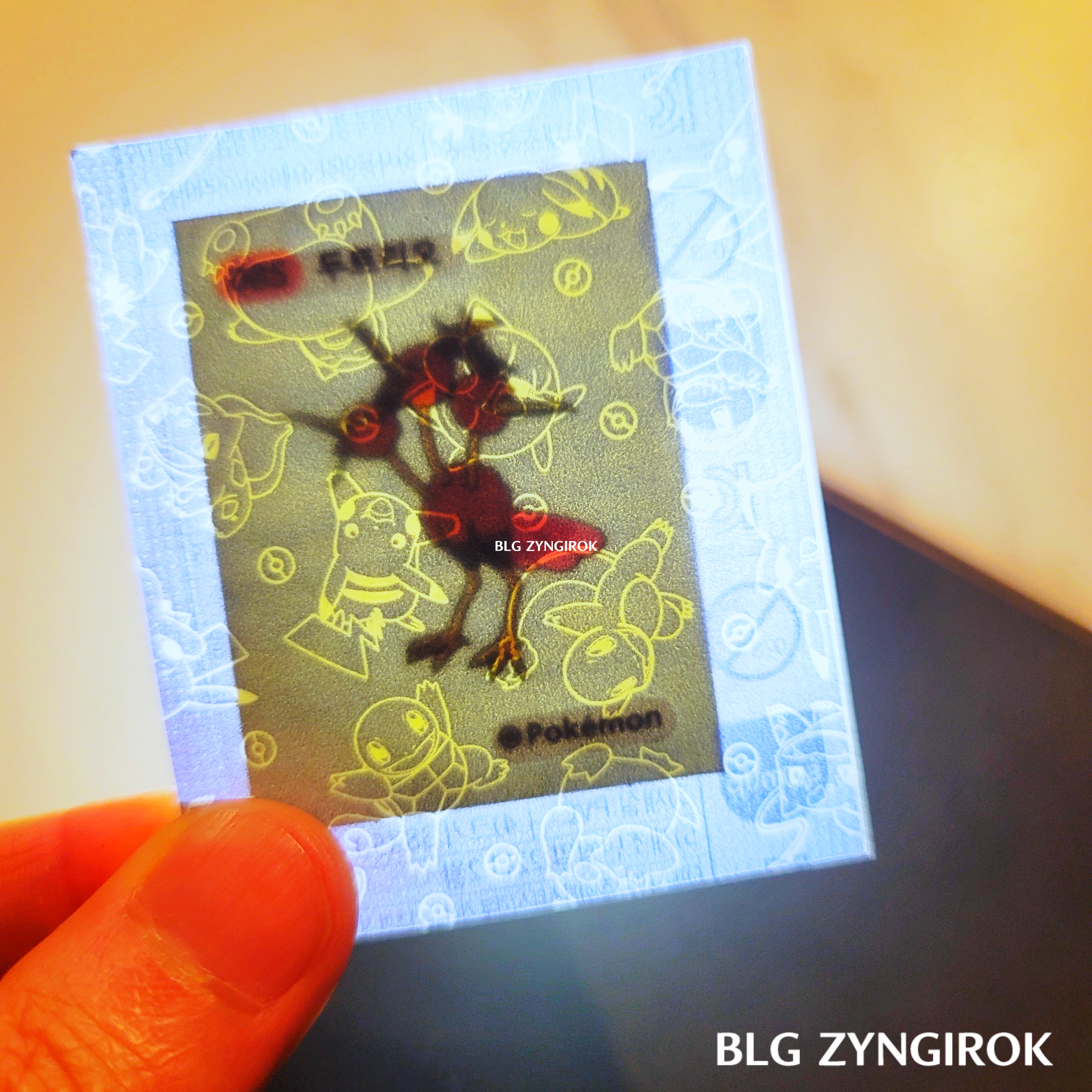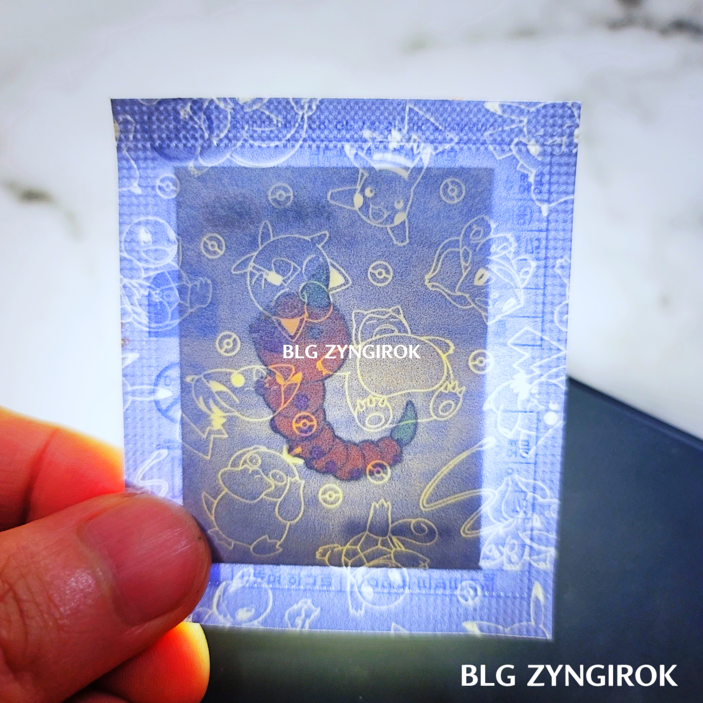 포켓몬스터빵-하나가-놓여있다.띠부띠부씰-독침붕을-들고있다.