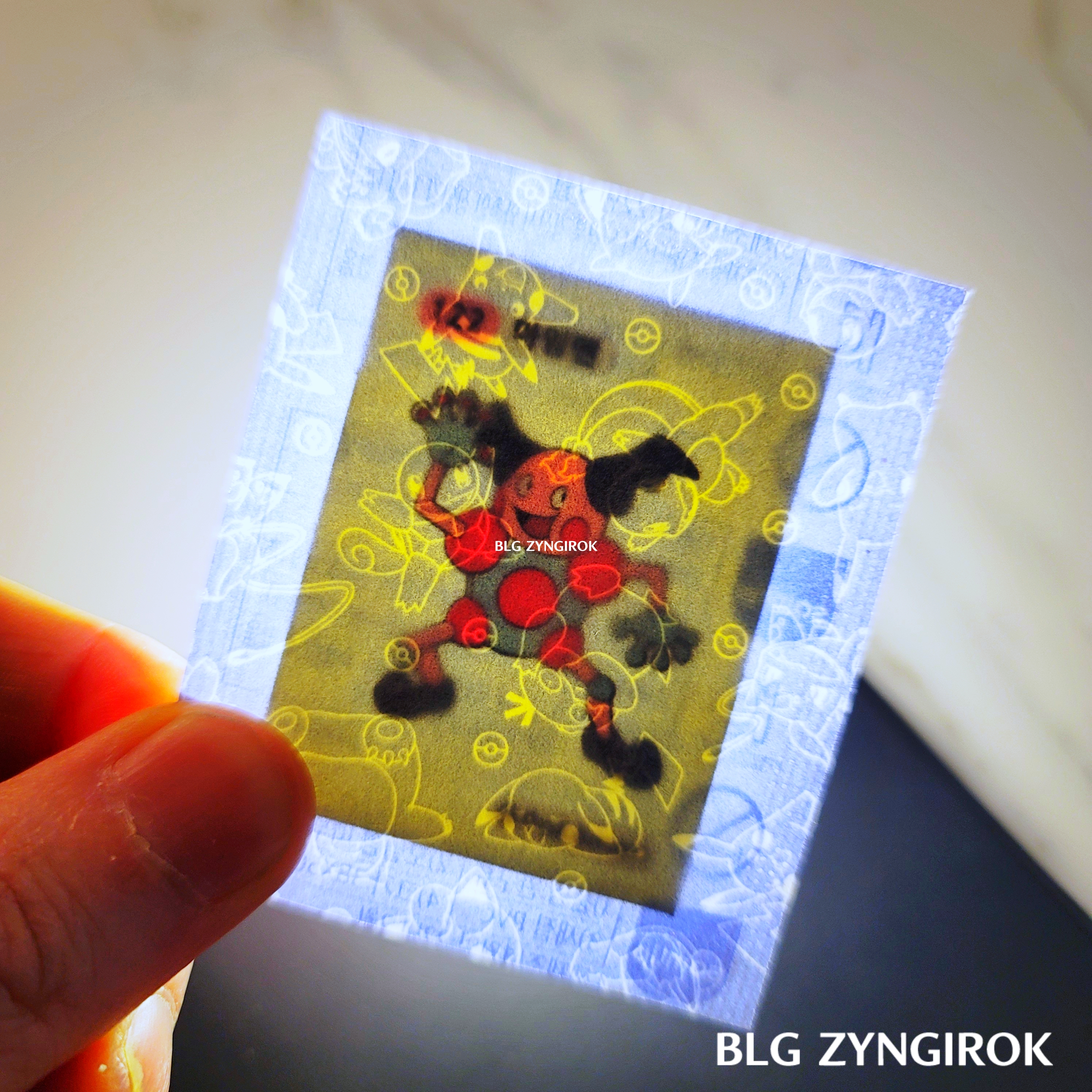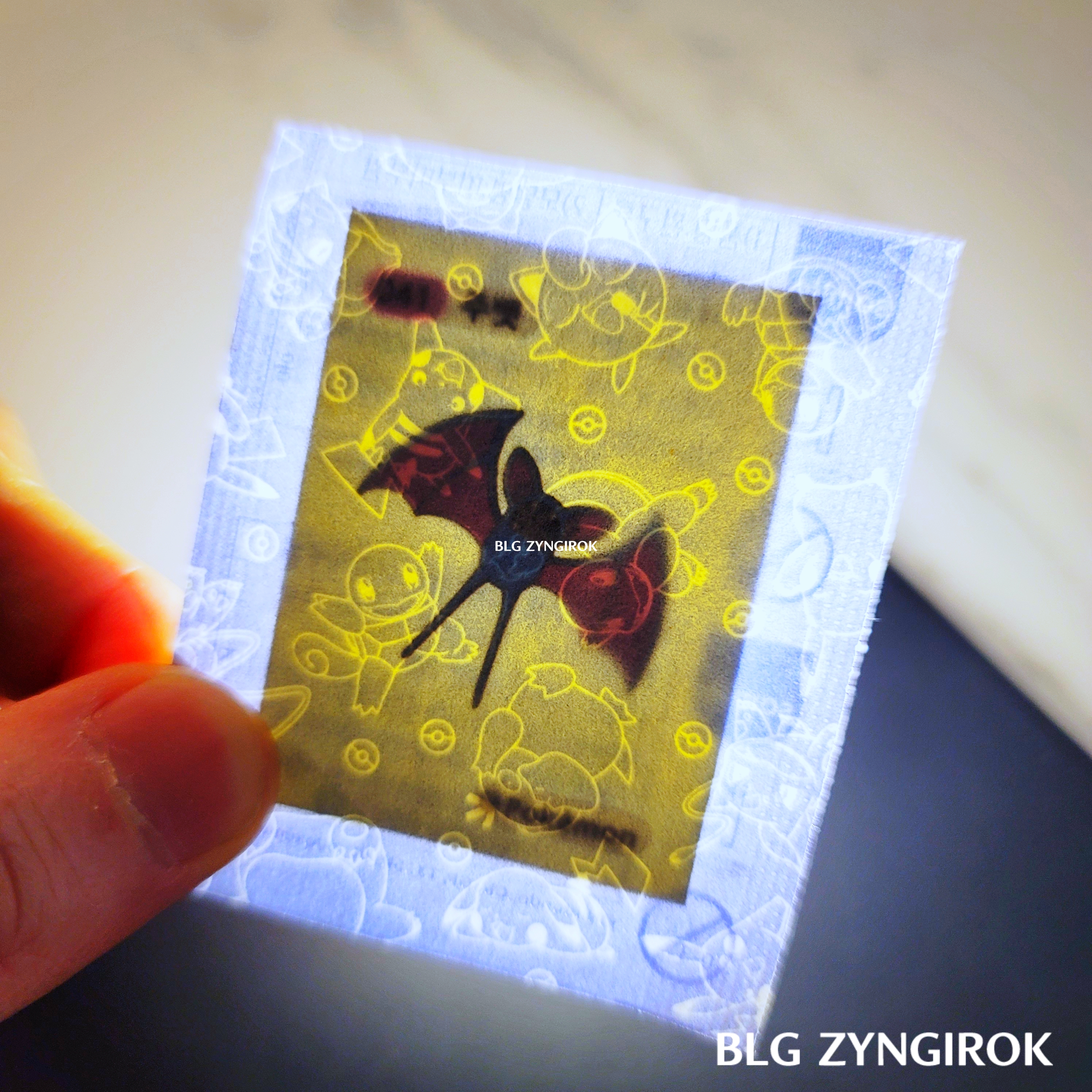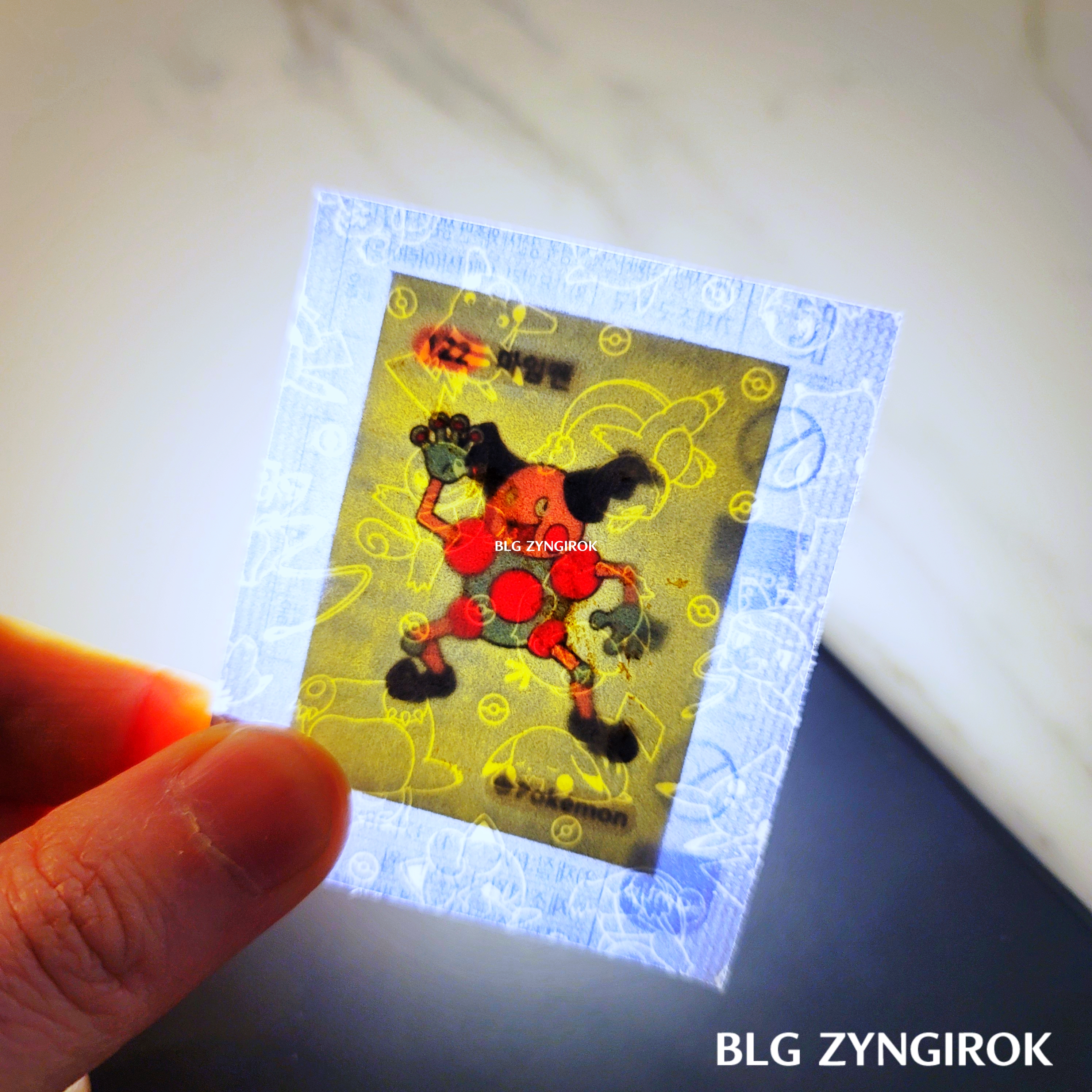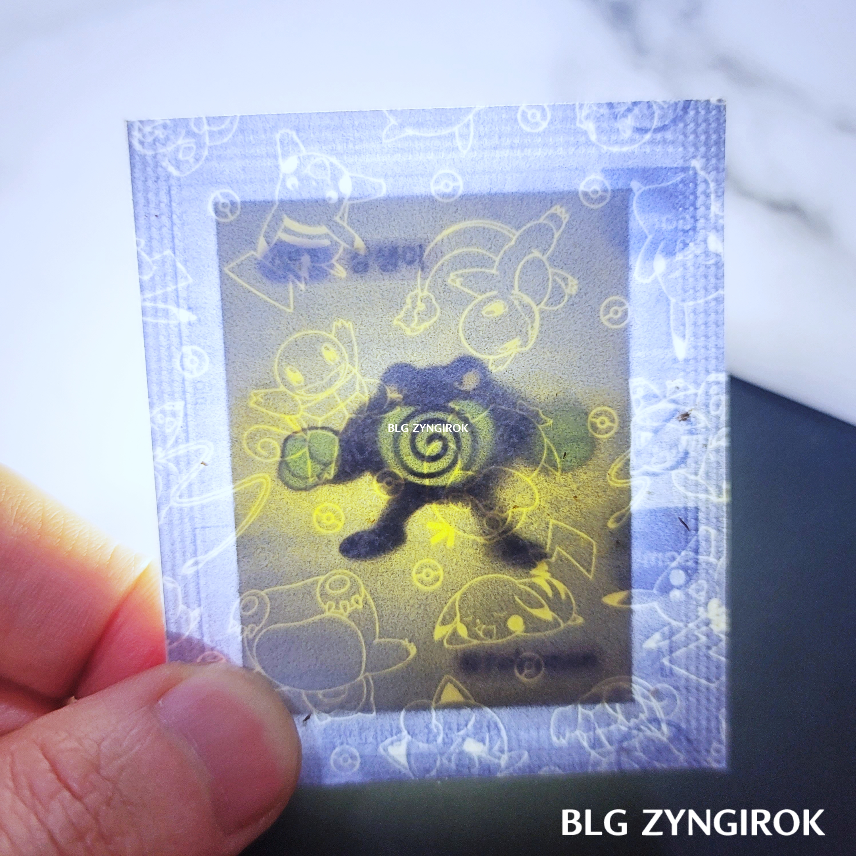 포켓몬스터빵-하나가-놓여있다.띠부띠부씰-독침붕을-들고있다.