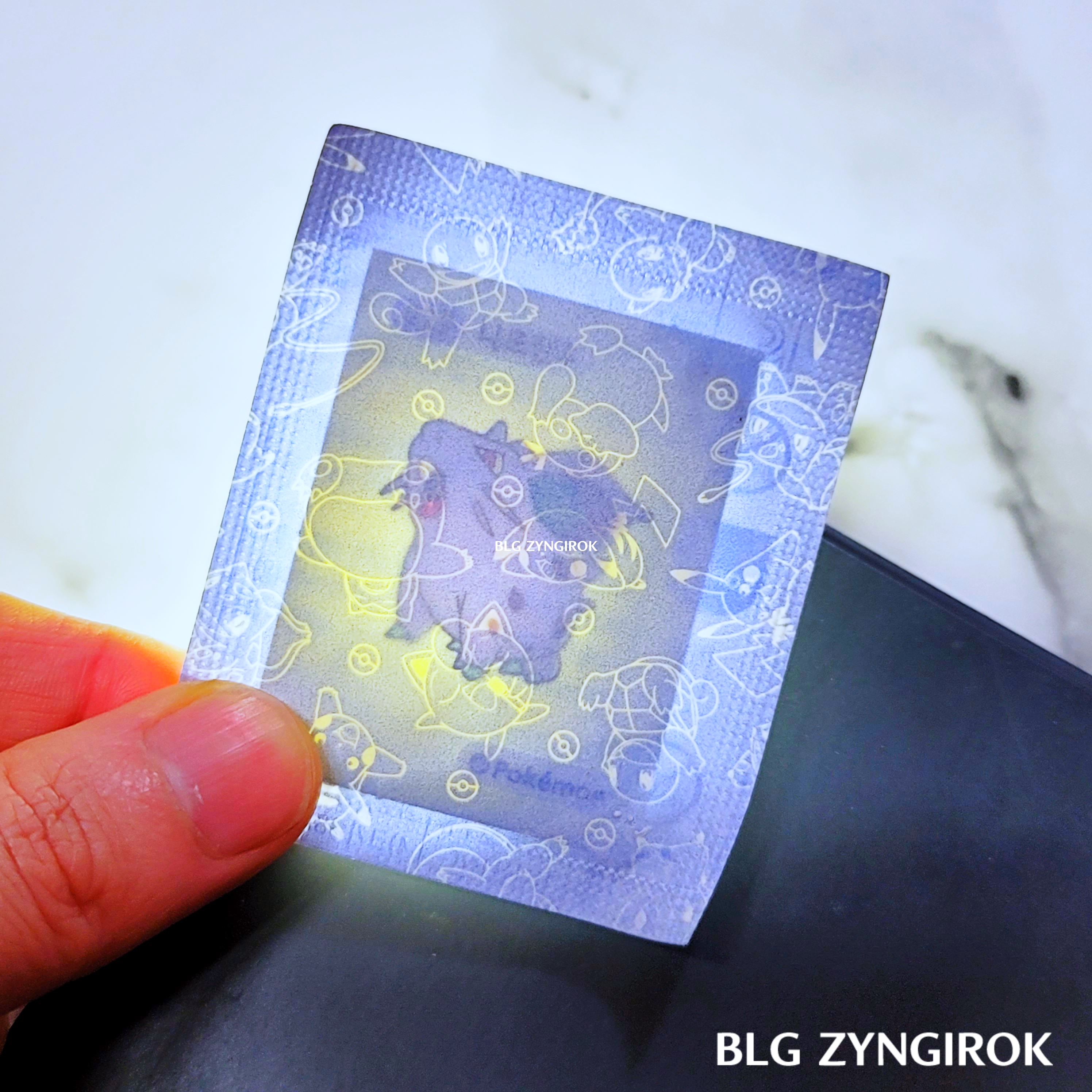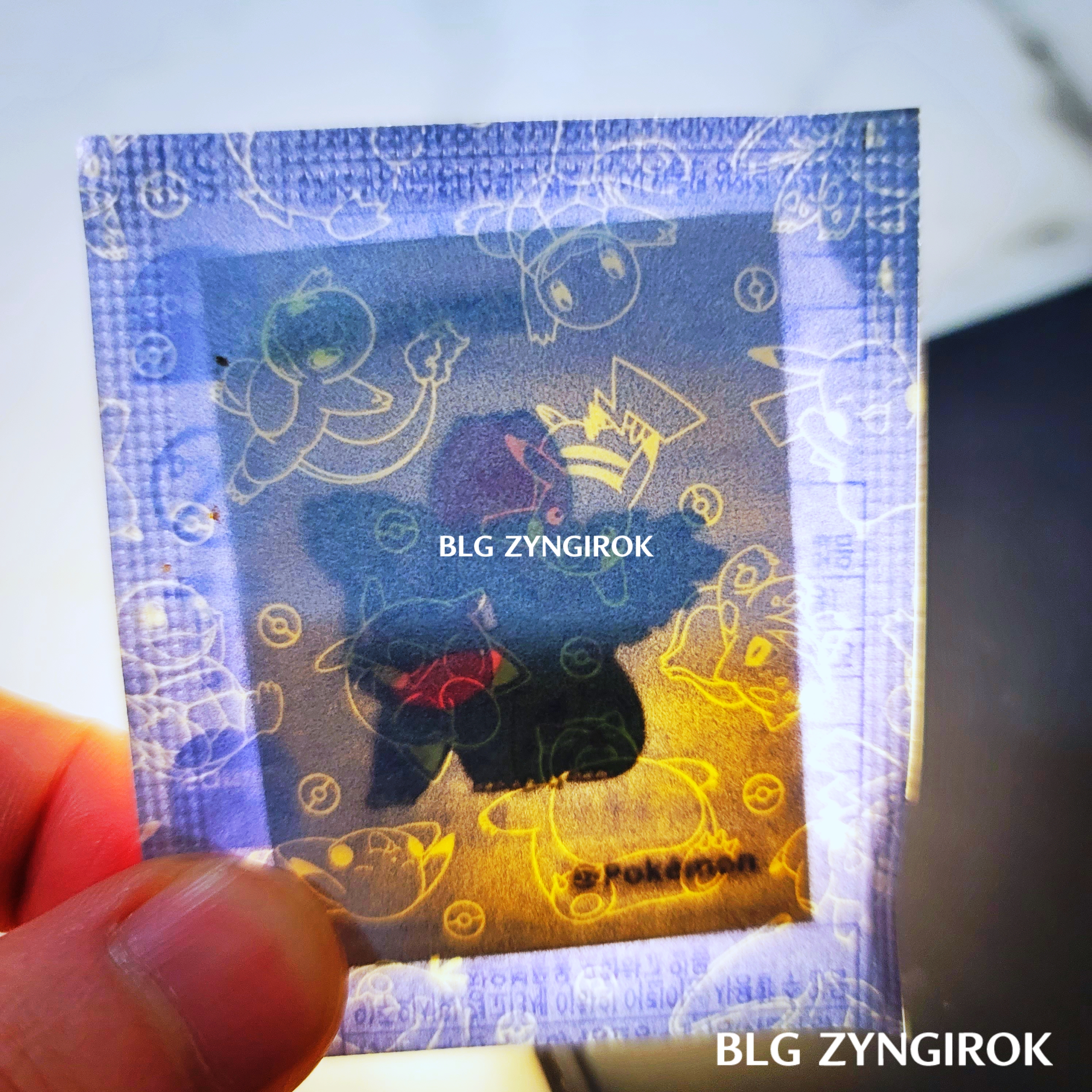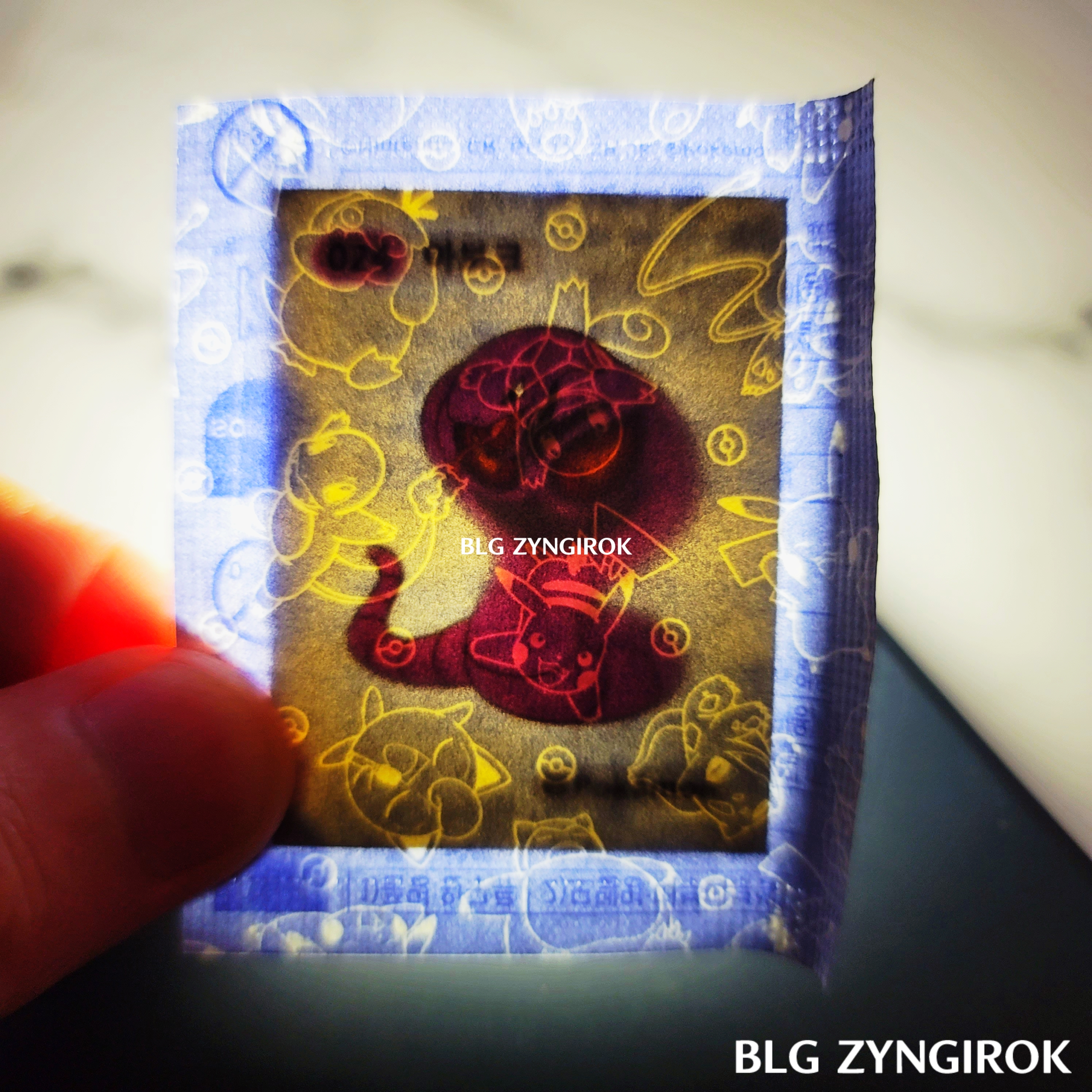 포켓몬스터빵-두개가-놓여있다.띠부띠부씰-피카츄를-들고있다.띠부띠부씰-구구를-들고있다.