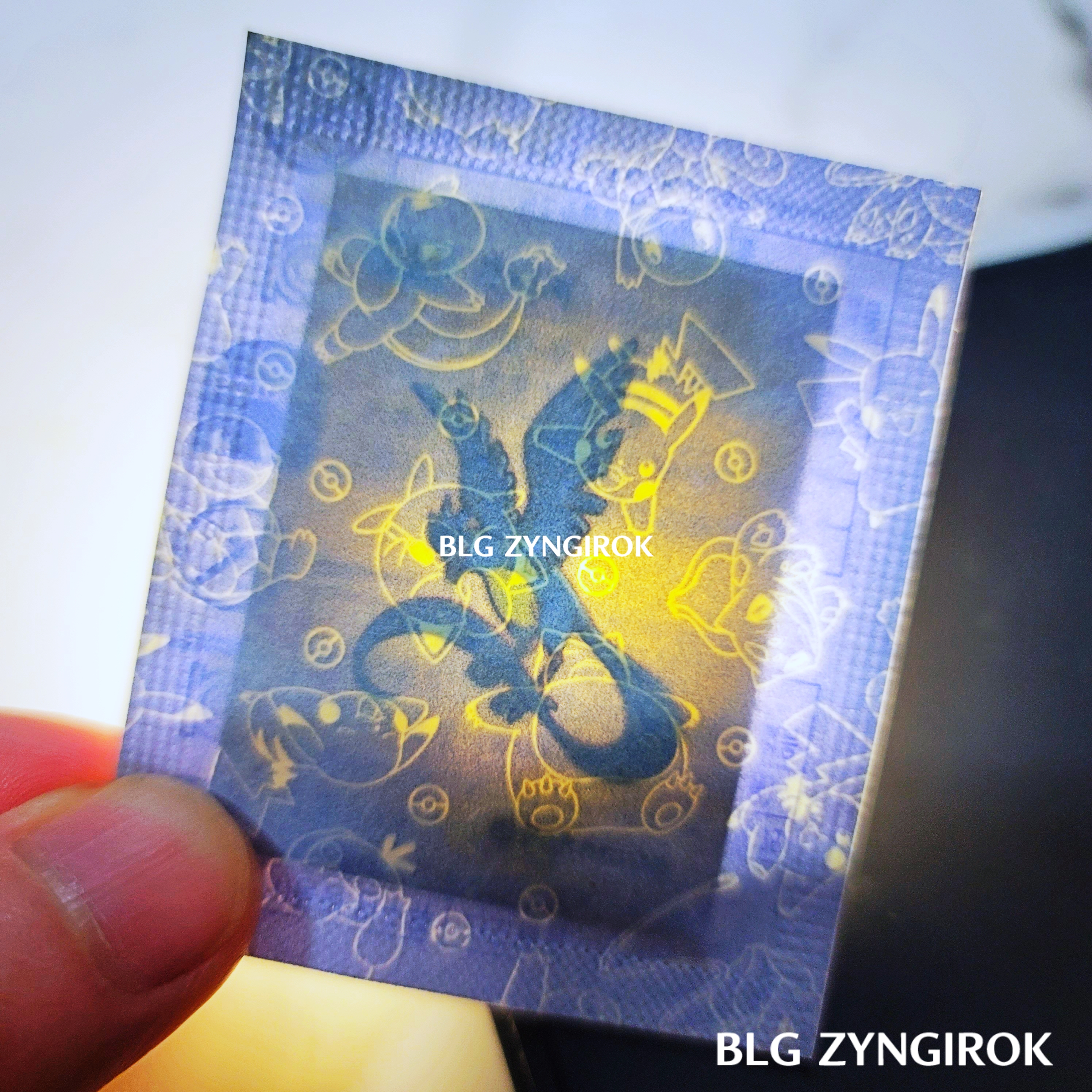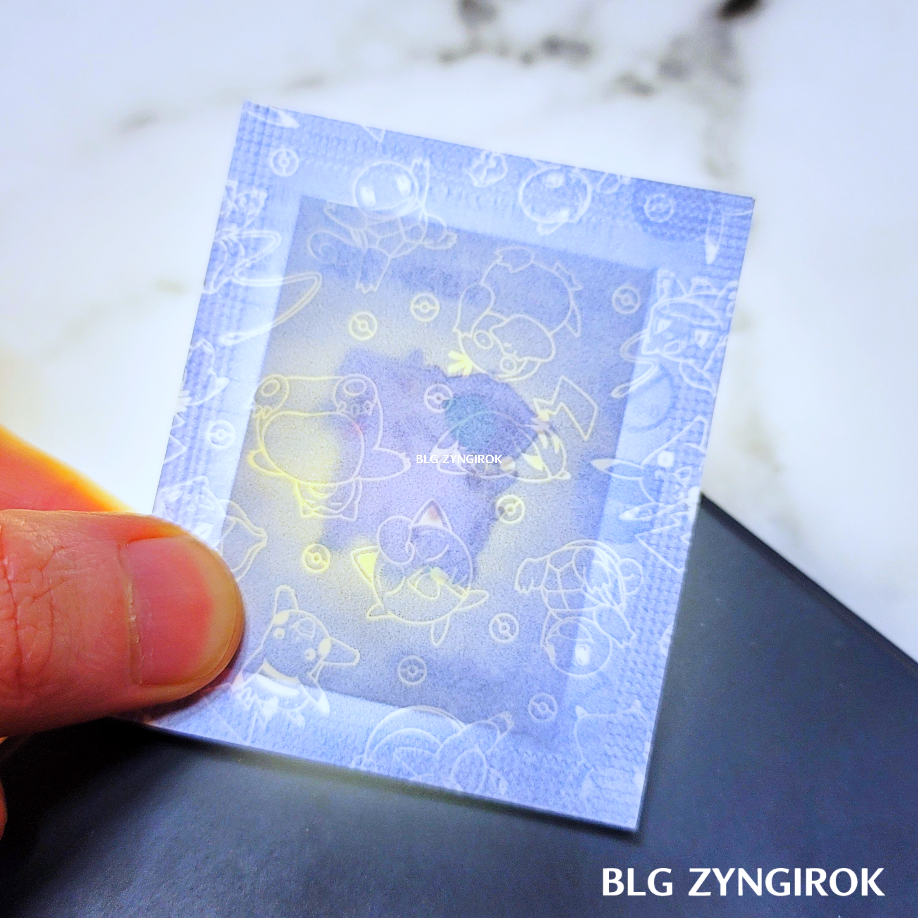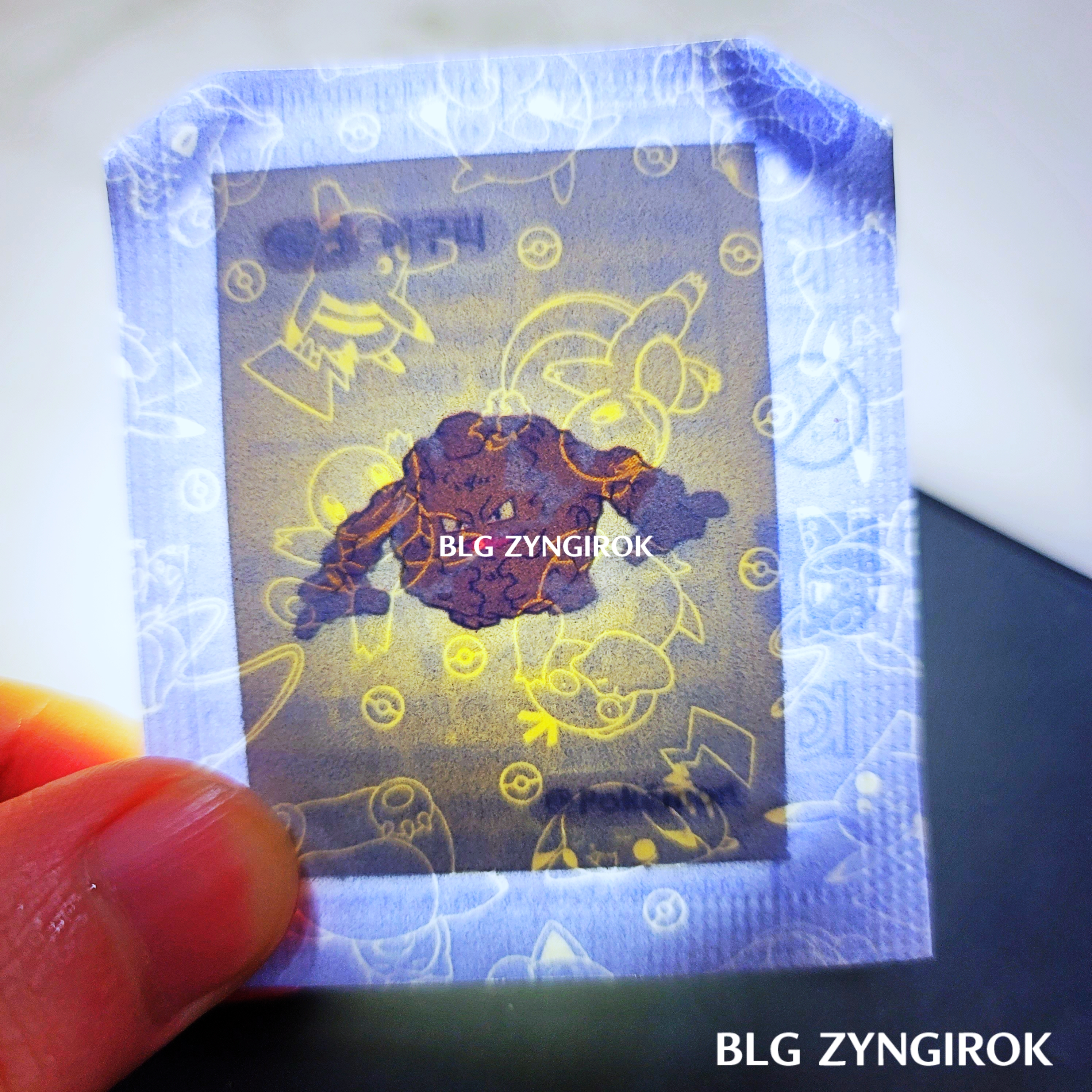 포켓몬스터빵-두개가-놓여있다.띠부띠부씰-피카츄를-들고있다.띠부띠부씰-구구를-들고있다.