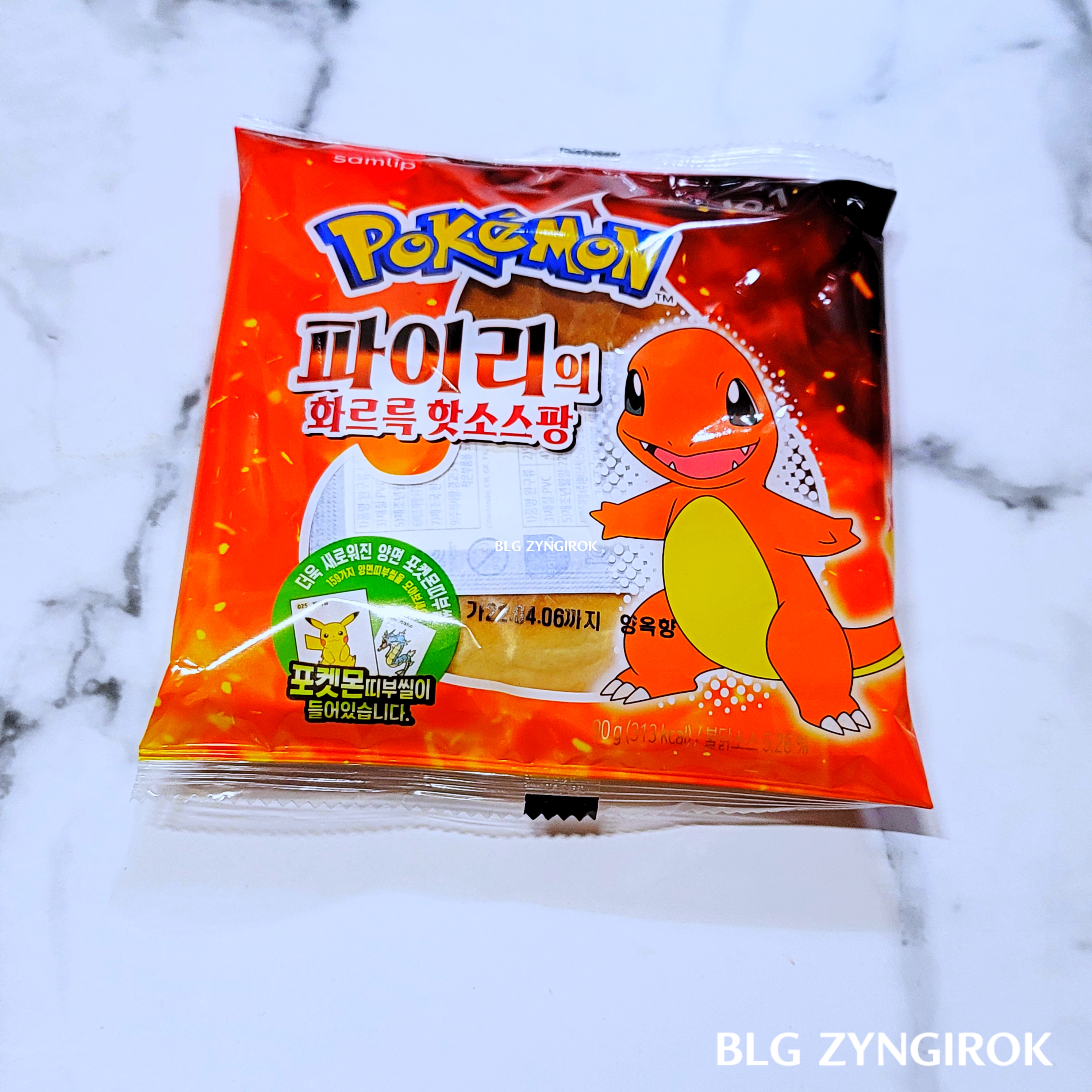 "파이리의 화르륵 핫소스팡" 진짜 맛있다. 그런데 스티커 용지는 기름기가 묻는다는 단점이 있다. 암스타 나왔다.