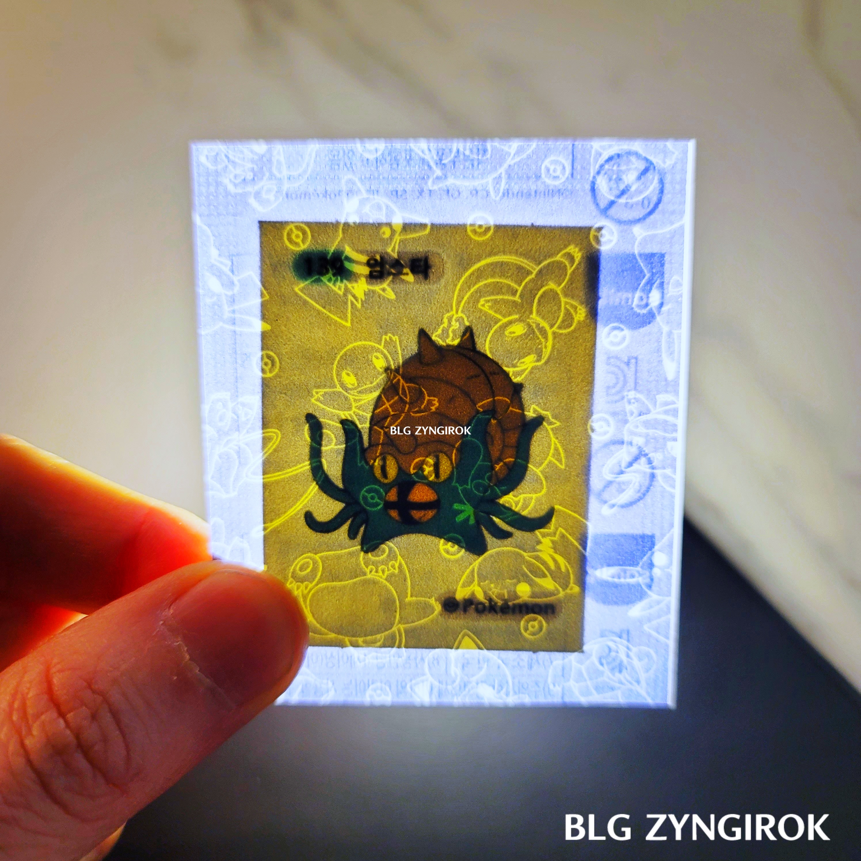 포켓몬스터빵-하나가-놓여있다.띠부띠부씰-내루미를-들고있다.