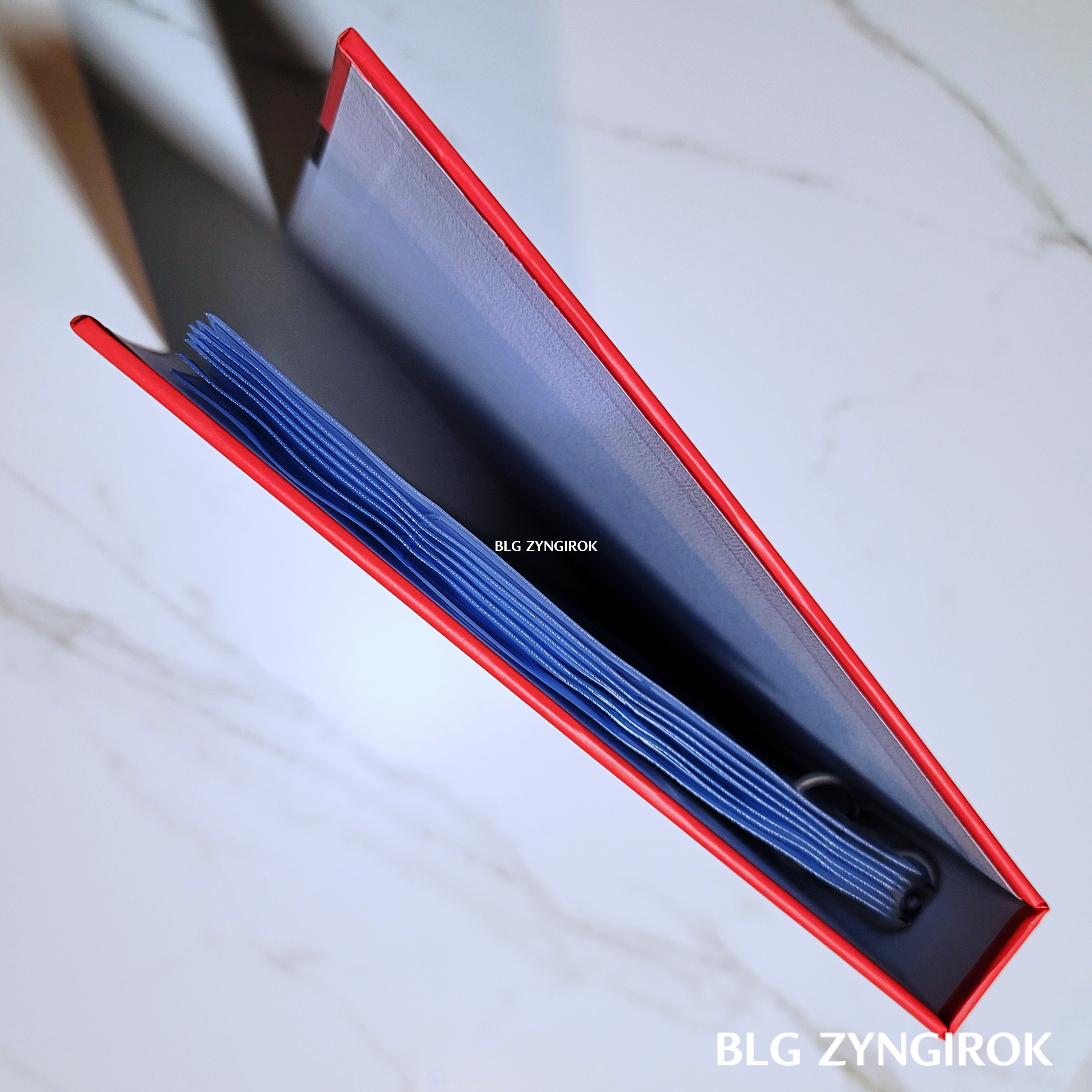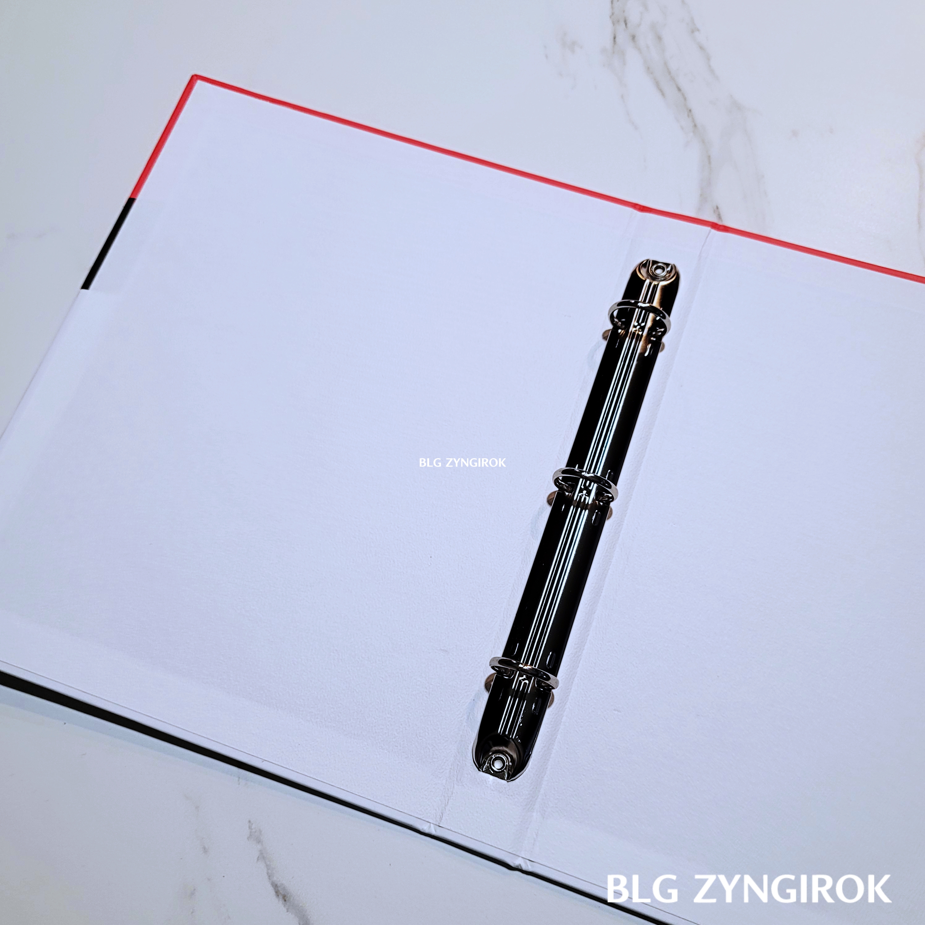 속지를 넣은 모습이다. 덥혀 있을 땐 딱 알맞고 펼쳤을 땐 사진처럼 좌우에 표지 여백이 많이 남는다. 이건 하드커버 링 바인더라 어쩔 수 없는 부분이다. 품질은 굉장히 좋다.